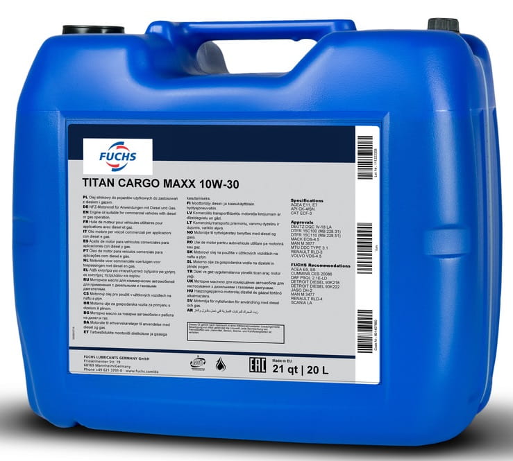 TITAN CARGO MAXX SAE 10W-30 to najwyższej jakości olej silnikowy, zmniejszający zużycie paliwa, przeznaczony do silników Diesla, z i bez turbosprężarki w samochodach ciężarowych, autobusach i maszynach przemysłowych. TITAN CARGO MAXX SAE 10W-30 zapewnia doskonałe właściwości zimnego startu i szybką cyrkulację oleju w całym silniku w niskich temperaturach. Wyjątkowa technologia dodatków skutecznie redukuje utlenianie i starzenie się oleju oraz przekracza wymagania API CK-4. TITAN CARGO MAXX SAE 10W-30 oferuje doskonałe osiągi przez cały okres między wymianami i zapewnia najlepszą ochronę silnika.